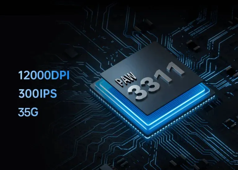 Оптический датчик PixArt 3311Легко справляется с отображением в формате 4K благодаря максимальной чувствительности 12 000 точек на дюйм, скорости отслеживания 300 IPS и ускорению 35G.